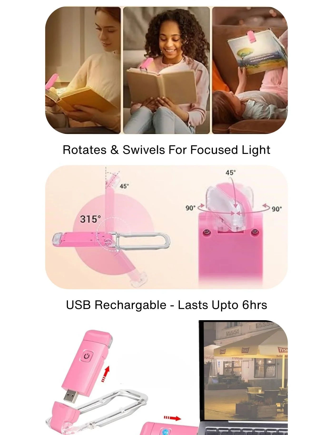 Perfect light for night reading. USB rechargeable battery lasts long and saves battery compared to others. Worth the money.
